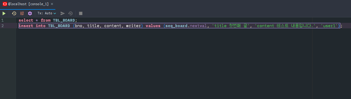 인텔리제이에서 select * from tbl_board 쿼리를 입력하여 결과를 보면 이렇게 데이터가 들어간 게 보입니다.