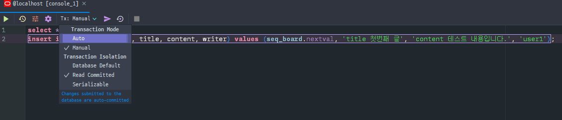 막상 다른 데이터툴로 조회를 하면 인텔리제이에서 날린 쿼리가 적용되지 않았습니다.