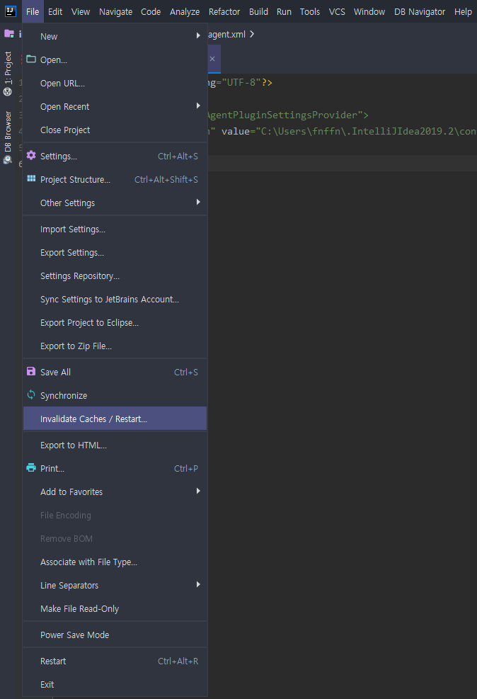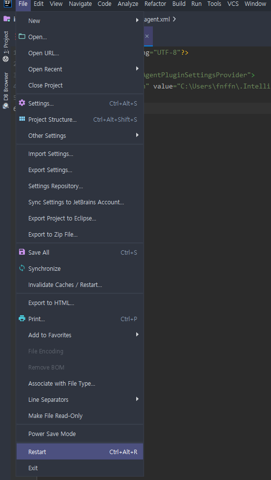 개발자의 공부방/에디터 & 유틸리티 [intelliJ] 인텔리제이 Restart 는 어떻게 하는건가? feat. plugin - 728x90 반응형 인텔리제이는 이클립스랑 다르게 Restart 버튼이 없습니다(?) 영어를 잘 모르는 저에게는 약간 당황했습니다 -_-... 하지만 자세히 보면 재시작 버튼이 숨겨져(?) 있습니다. 보이시나요...? ** 재시작 버튼 어디있게요?? ** File → Invalidate Cached / Restart... 이걸 누르면 Restart 선택지가 나옵니다 -_- 저는 단축키도 없는(설정하기도 귀찮) 이 클릭질 두 번의 짜증남 때문에 답을 찾으려고 노력했습니다... ** JUST 라고 친절하게 써줬다 ** 그리고 찾았지요!! Marketplace 에 들어가서 Restart 를 검색하시면 바로 아래와 같은 플러그인이 나옵니다. ** 12800명이 받음... ** 이제 아래와 같이 Restart 버튼이 생겼습니다! ** 단축키도 있음.. ** 반응형 공유하기 게시글 관리 준수한쭈니네 저작자표시 (새창열림) '개발자의 공부방 > 에디터 & 유틸리티' 카테고리의 다른 글 [이클립스] SVN History 전체 내역 보기 (0) 2019.11.26 [DBeaver] MySQL8 feat. Public Key Retrieval is not allowed (0) 2019.09.14 [IntelliJ] 인텔리제이 필수 Plugins 플러그인!! feat. Key Promoter X (0) 2019.09.14 [DBeaver] Dbeaver MySQL 접속 에러 feat. serverTimeZone (0) 2019.09.10 [IntelliJ] 인텔리제이 Data Grip 중 SQL 쿼리문 동작이 안될 때 (insert 적용이 안되는 경우 등..) (2) 2019.08.20 Contents 당신이 좋아할만한 콘텐츠 [이클립스] SVN History 전체 내역 보기 2019.11.26 [DBeaver] MySQL8 feat. Public Key Retrieval is not allowed 2019.09.14 [IntelliJ] 인텔리제이 필수 Plugins 플러그인!! feat. Key Promoter X 2019.09.14 [DBeaver] Dbeaver MySQL 접속 에러 feat. serverTimeZone 2019.09.10 댓글 0 + 이전 댓글 더보기
