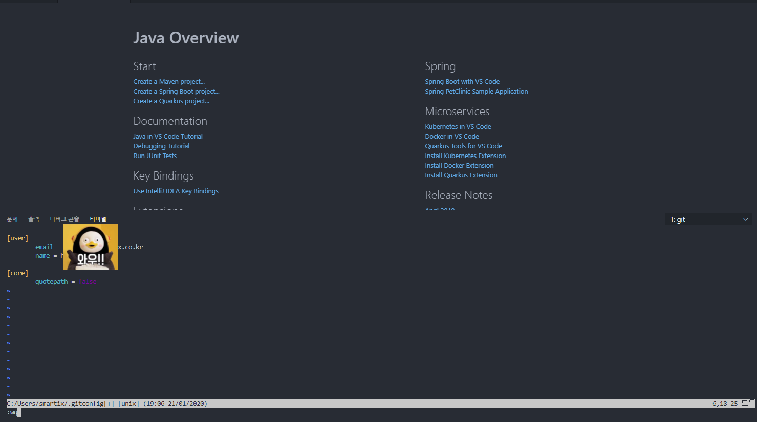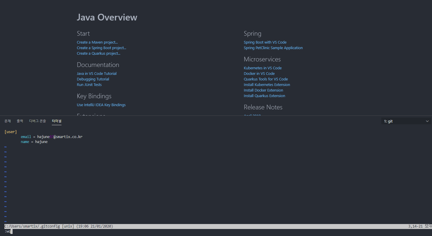 4) 이제 단축키로 편집기에 작성과 저장하고 나가기를 할 수 있으니 아래와 같이 작성후 저장합니다. (위의 사진 참고!)