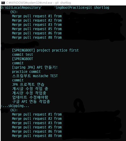 윈도우 CMD도 똑같이 git shortlog 를 입력하면! 한글이 정상적으로 출력되는 것을 확인하실 수 있습니다.
