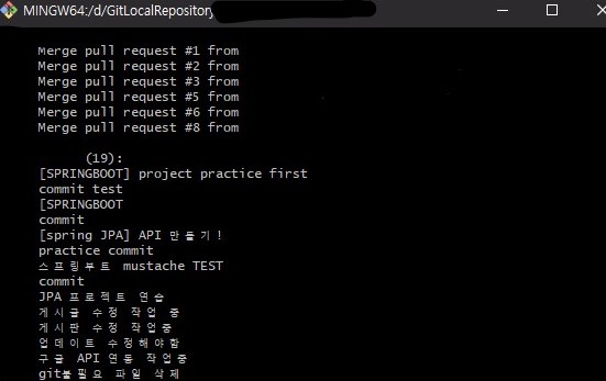 인텔리제이에서 git shortlog 를 입력하고 한글로 commit 한 메시지가 제대로 출력되어 나오고 있습니다.