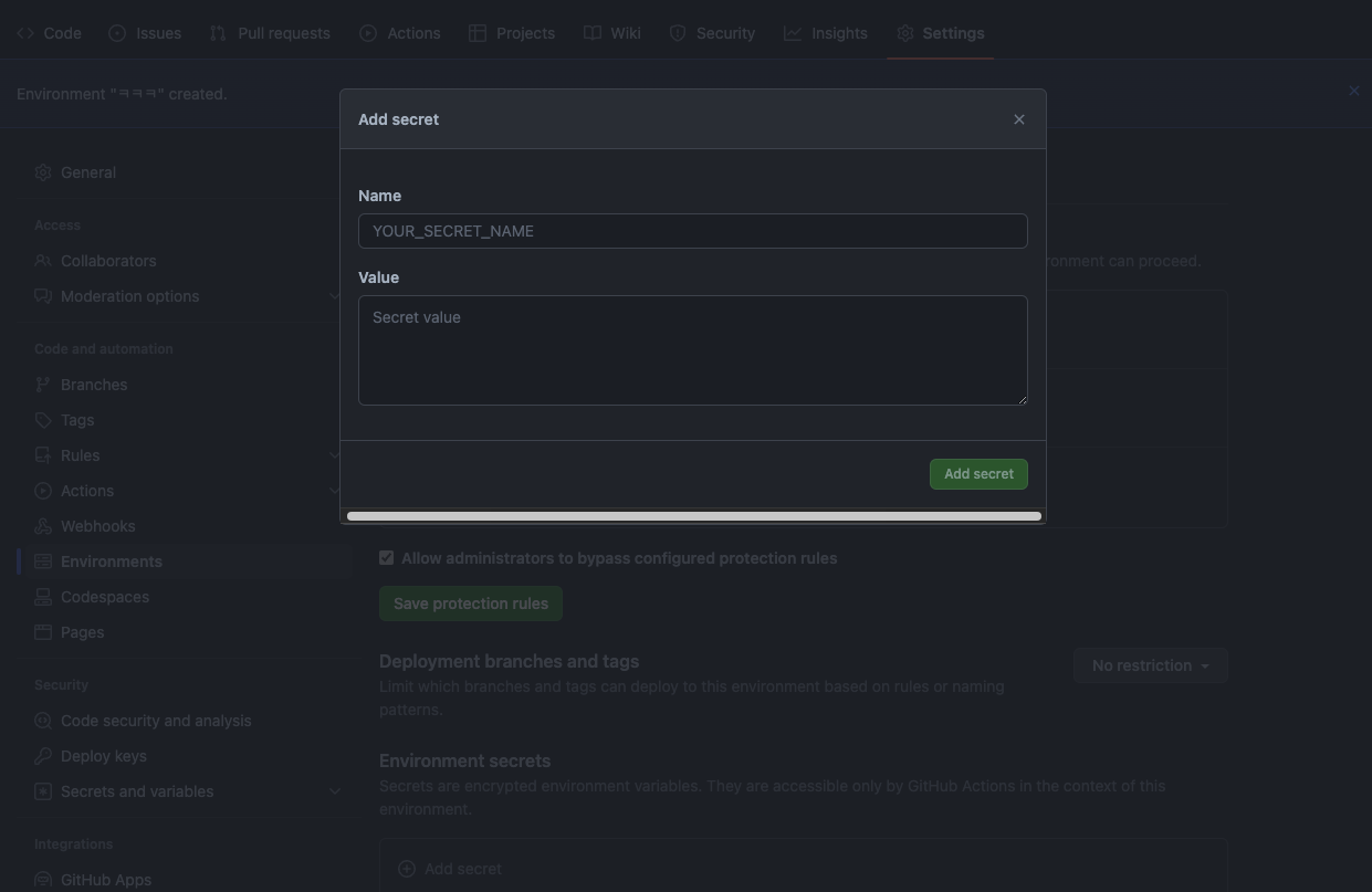 아래 보시면 Environment secrets 목록에 +Add secret 을 누릅니다