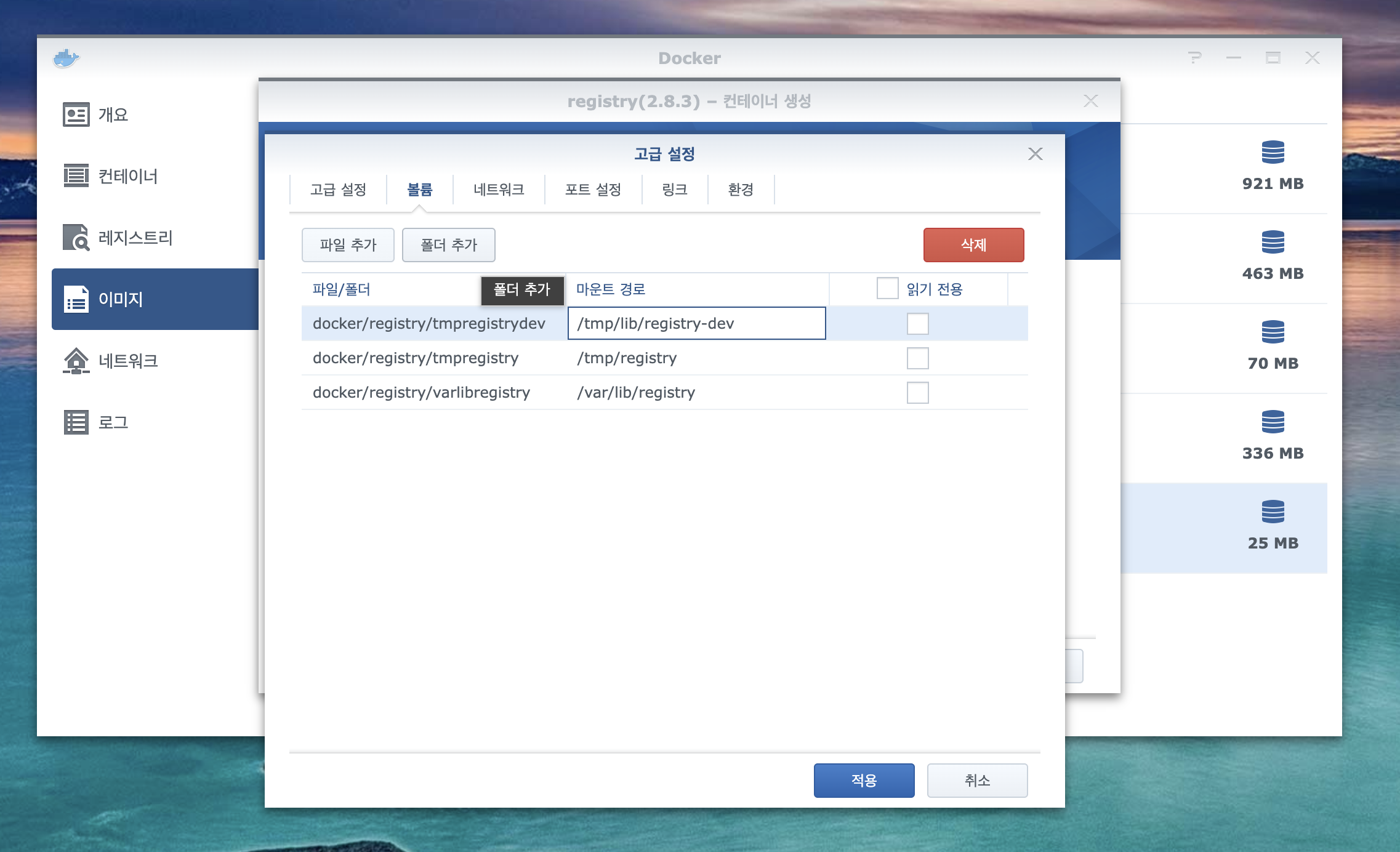 /volume2/docker/registry/tmpregistry : 임시 이미지 경로