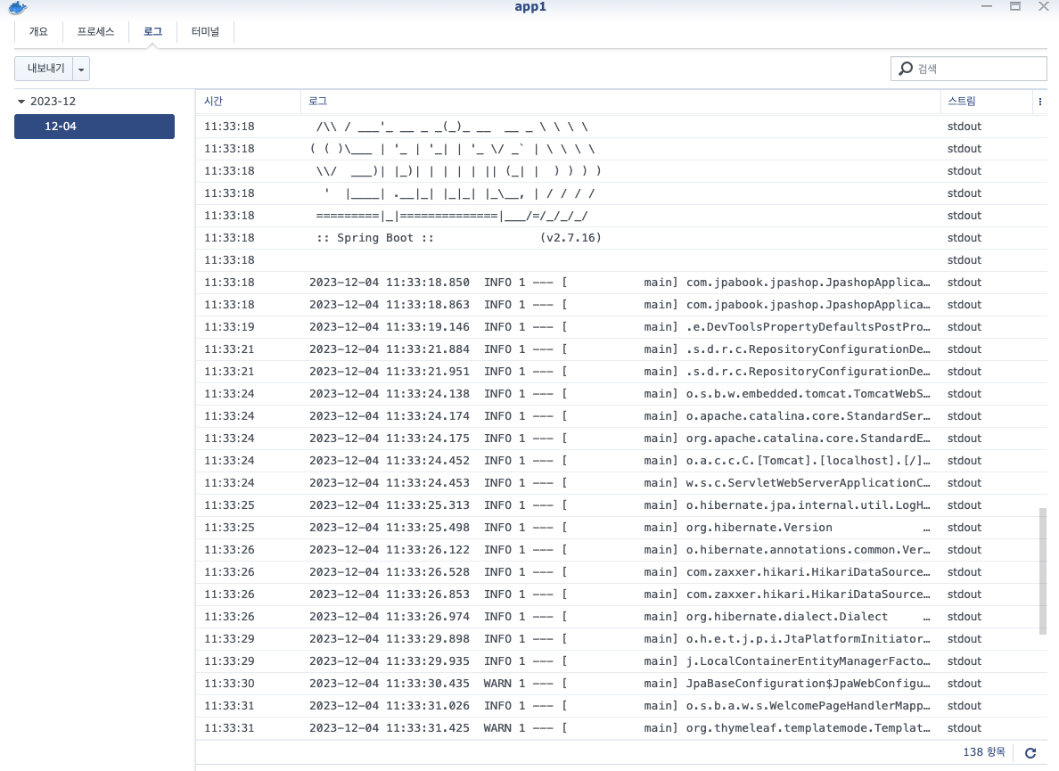 로그 상에 스프링부트 로고와 함께 기본적인 로그가 띄워져있습니다. 성공입니다.